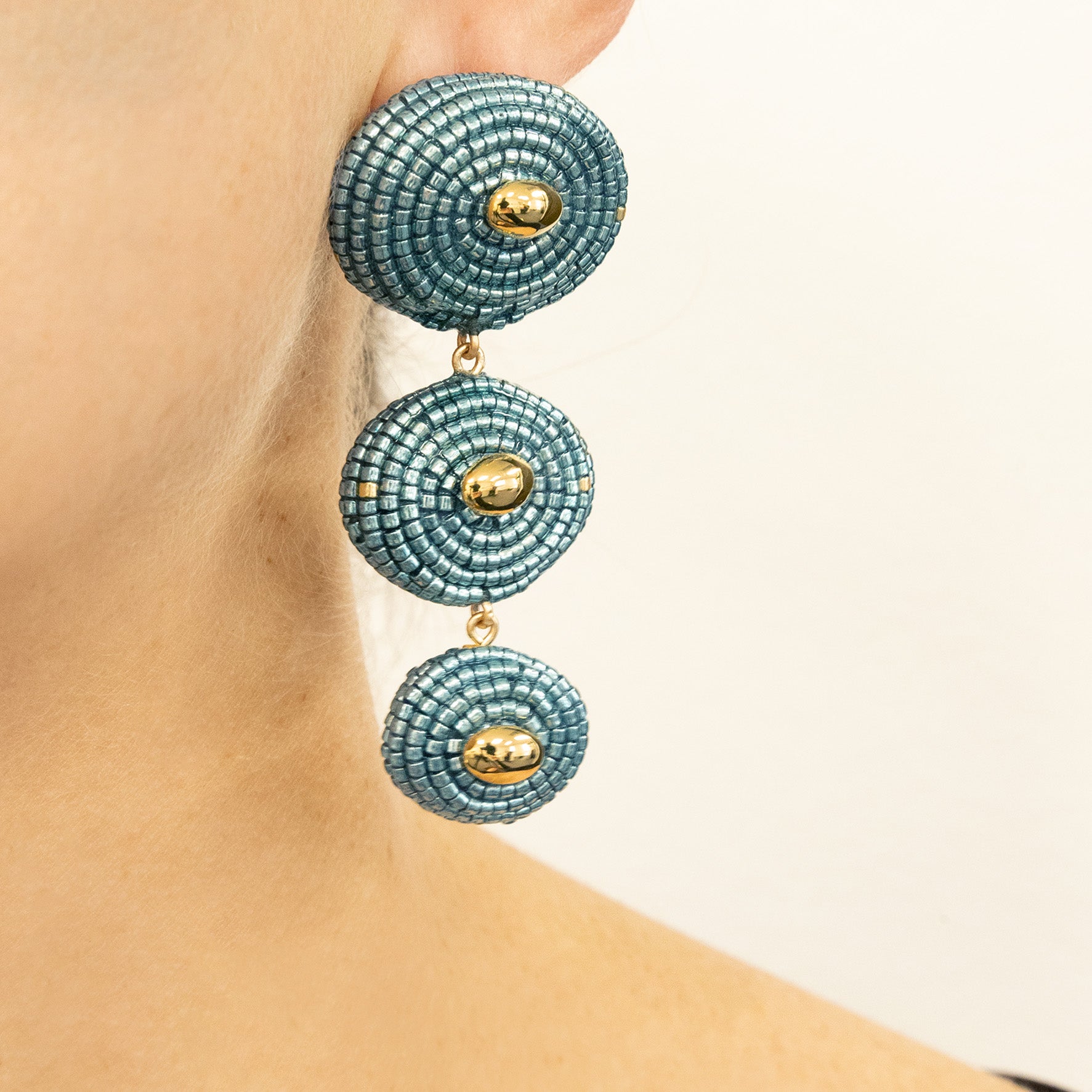 The Onda Earrings capture the serene rhythm of the ocean waves in a dynamic triple disc design. Each concentric circle is meticulously crafted to créate a harmonious blend of movement and stability, making these earrings a perfect expression of balance and grace.